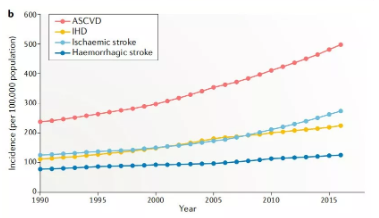 腦卒中、冠心病等心血管疾病(Cardiovascular disease,CVD)是造成我國居民死亡和疾病負(fù)擔(dān)的首要病因,占中國死亡人口的40%,CVD發(fā)病率呈現(xiàn)逐年快速攀升的趨勢(shì),目前我國CVD患者超過 2.9 億例。動(dòng)脈硬化性心血管疾?。ˋtherosclerotic cardiovascular disease,ASCVD)是一種單一類型的心血管疾病,包括缺血性卒中(Ischaemic stroke)和缺血性心臟?。↖schaemic heart disease,IHD)。從1990年至2016年,ASCVD的死亡人口增加近100萬,據(jù)統(tǒng)計(jì)2016年約有240萬人死于ASCVD,占CVD總死亡人口的61%,占所有死亡的25%。