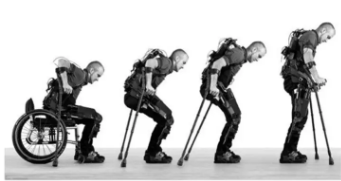 2010年,伯克利仿生研究所研制出的一種由電池提供動力的機械骨骼系統(tǒng)“eLEGS“。這是世界上第一款不使用繩或鏈達到自然行走目標的外骨骼,使用者通過手臂姿勢控制,向前移動右拐杖,則左腿隨之向前移動,幫助截癱患者擺脫輪椅以自然步態(tài)行走。