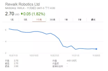 ReWalk公司于2014年9月在納斯達克上市,上市第一個月受到了市場追捧,股價創(chuàng)新高,最高超過30美元,較發(fā)行價上漲超過3倍,動態(tài)PS達到80倍。但由于持續(xù)大額的虧損以及遲遲打不開市場,之后股價就開始一路下挫。