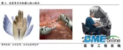 達芬奇手術機器人代表著當今手術機器人最高水平,它有三個關鍵核心技術:可自由運動的手臂腕部Endo Wrist、3D高清影像技術、主控臺的人機交互設計。