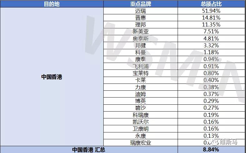 中國香港市場為中國心電圖出口第三大市場,共計25家出口商,占全年心電圖出口8.84%的份額, 其中深圳邁瑞在中國香港市場占有率高達51.94%。