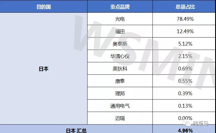 日本市場為中國心電圖出口第五大市場,共計9家出口商,占全年心電圖出口4.96%的份額。其中光電在日本市場占有率高達78.49%。