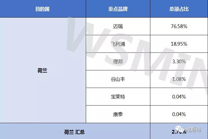 荷蘭市場為中國心電圖出口第七大市場,共計6家出口商,占全年心電圖出口2.76%的份額。其中深圳邁瑞在荷蘭市場占有率高達76.58%。