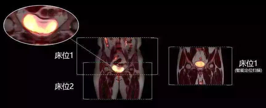(左圖主要器官分散在兩個(gè)床位時(shí)的成像,右圖為智能定位能將床位全部置于主要器官中心時(shí)成像,避免了由于主要器官分散在兩個(gè)床位產(chǎn)生的圖像錯(cuò)配,也提高了主要器官的PET/MR圖像質(zhì)量。)