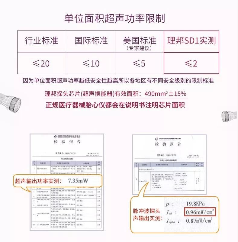 此外,SD1胎心多普勒儀的單位輸出功率是2mW/cm2,通常單位面積超聲功率越低,安全性越高,因此全球各地對輸出功率均有嚴格的安全級別限制標準:國家行業(yè)標準≦20mW/cm2,國際標準≤10mW/cm2,美國標準≤5mW/cm2,而理邦儀器胎心監(jiān)護產(chǎn)品的輸出功率能夠做到2mW/cm2,安全性級別更高。