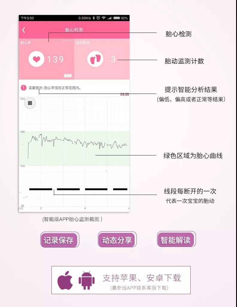 除了這些優(yōu)勢,SD1胎心多普勒儀還有一些“錦上添花”的功能:支持藍牙無線連接手機APP,實現(xiàn)更強大的功能:不僅可以實時顯示胎心率數(shù)值、胎動以及胎心率曲線,其檢測記錄還支持曲線回顧、播放回顧,并可通過連接APP將檢測記錄進行分享。