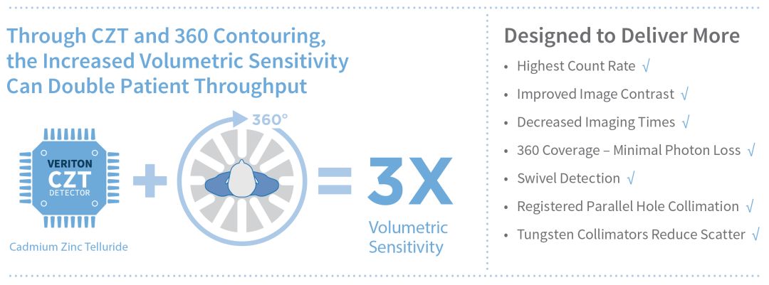 新的VERITON?在設(shè)計時考慮了三維人體。它使用12個獨立的探測器臂提供360度覆蓋。通過用檢測器圍繞患者,與傳統(tǒng)的雙頭陣列相比,光子檢測最大化并且圖像質(zhì)量得到增強(qiáng)。