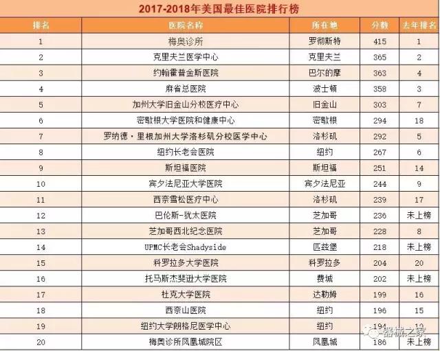 在醫(yī)療界梅奧診所就是傳說中的麥加,世界頂尖的醫(yī)療機構(gòu)。2017年8月8日,《美國新聞與世界報道》公布了2017-2018美國最佳醫(yī)院排行榜,梅奧診所以415分的總分再次榮登榜首,并在糖尿病和內(nèi)分泌專科、胃腸科、婦科、腎臟科、神經(jīng)??坪屠夏瓴W(xué)六個專科中排名第一。