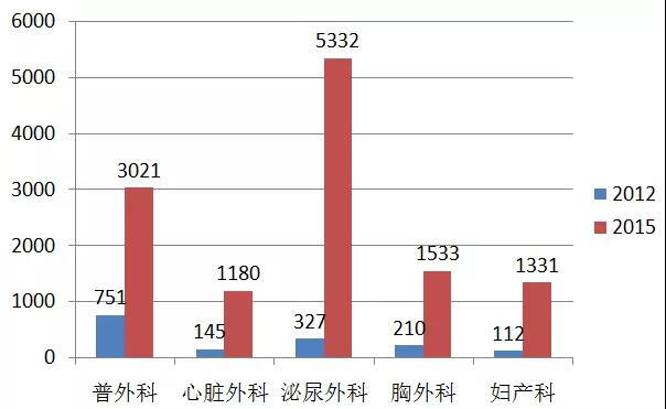 2012年和2015年,國(guó)內(nèi)手術(shù)機(jī)器人手術(shù)量比較