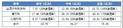 根據(jù)以上測(cè)算數(shù)據(jù)以及合理預(yù)計(jì),對(duì)國(guó)內(nèi)每年的手術(shù)機(jī)器人市場(chǎng)規(guī)模進(jìn)行估算。因此,從保守、中性和樂觀三種測(cè)算來看,現(xiàn)階段我國(guó)每年手術(shù)機(jī)器人服務(wù)市場(chǎng)的規(guī)模為23.76億元、54.27億元和75.35億元。但隨著手術(shù)機(jī)器人成本降低以及技術(shù)水平提高,其在普外和心臟外科的滲透率也會(huì)提高,市場(chǎng)規(guī)模將進(jìn)一步擴(kuò)大。