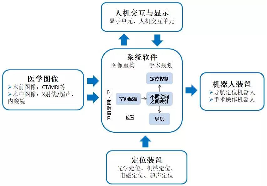 手術(shù)機(jī)器人主要的功能模塊包括人機(jī)交互與顯示、醫(yī)學(xué)圖像、系統(tǒng)軟件、機(jī)器人裝置、定位裝置。系統(tǒng)軟件中的圖像重構(gòu)、空間配準(zhǔn)和定位控制等,是手術(shù)機(jī)器人最為核心的部分;而硬件輔助裝置如醫(yī)學(xué)圖像、機(jī)器人裝置和定位裝置需要與臨床手術(shù)具體情況相結(jié)合;人機(jī)交互與顯示必須充分考慮醫(yī)生的需求和臨床應(yīng)用場(chǎng)景。