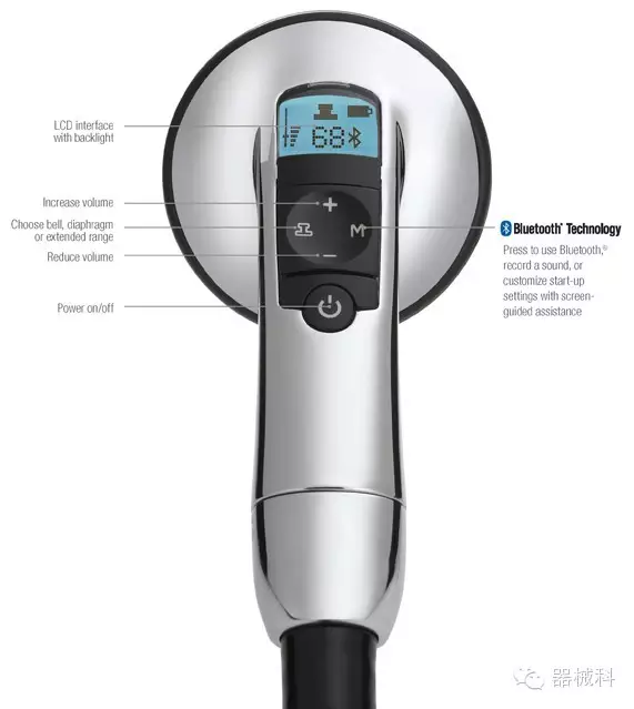 2009年,電子聽診器的發(fā)展達(dá)到了新的巔峰,Littmann®3200型電子聽診器(上圖)出現(xiàn)在世人面前。這是首個運(yùn)用藍(lán)牙技術(shù)的電子聽診器,它能夠?qū)⑿呐K、肺部和其他身體器官的信號無線傳送到醫(yī)師使用的電腦,并通過Cardioscan軟件實(shí)時地將聲音曲線顯示在電腦屏幕上,更準(zhǔn)確地揭示患者心臟可能存在的異?,F(xiàn)象。隨后,軟件會對聲波曲線進(jìn)行分析,并將代表有害雜音的異常部分的細(xì)節(jié)突出顯示出來。醫(yī)師能夠?qū)⒒胤潘俣冉档鸵话雭砀屑?xì)地分析問題,還能將文件保存到患者的檢查結(jié)果中,并通過電子郵件和Scope to Scope遠(yuǎn)程聽診軟件,將其發(fā)送給心臟病專家來確認(rèn)診斷結(jié)果。這套系統(tǒng)不僅能夠準(zhǔn)確捕捉到危險的雜音,還能減少更為昂貴心電圖檢查費(fèi)用和不必要的心臟病專家的診療工作。從此傳統(tǒng)的電子聽診器變成了先進(jìn)的醫(yī)療工具,取代了醫(yī)師對心臟雜音的猜測,提高了診斷能力。隨后3M公司推出了一系列改良產(chǎn)品......目前這方面3M公司的最新產(chǎn)品是Littmann4100系列(下圖)