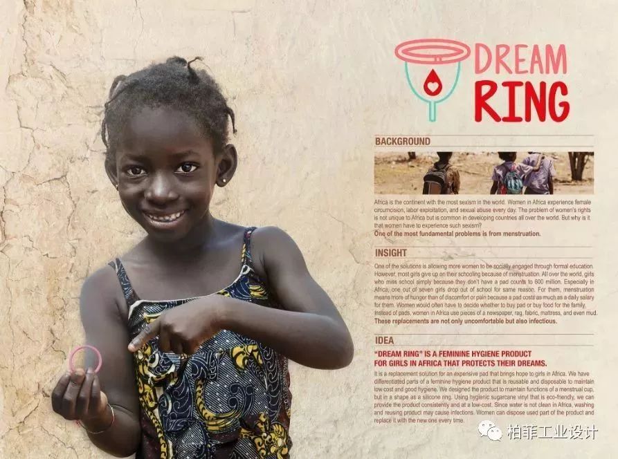 設計說明:非洲婦女每天都會經(jīng)歷性別偏見和歧視,而針對這個問題所提出的解決方案是讓更多的女性參與正規(guī)教育。無法取得便宜且衛(wèi)生的女性衛(wèi)生用品是許多非洲女孩放棄上學的主要原因之一。一片衛(wèi)生棉可能會花掉一天的工資,迫使婦女在經(jīng)期來時會使用報紙、破布、布料甚至泥土。DREAM RING是一款便宜又環(huán)保的女性衛(wèi)生用品,由矽膠環(huán)和甘蔗乙烯制成??芍貜褪褂玫奈z環(huán)和拋棄式的甘蔗乙烯是DREAM RING既經(jīng)濟又安全的關(guān)鍵因素。