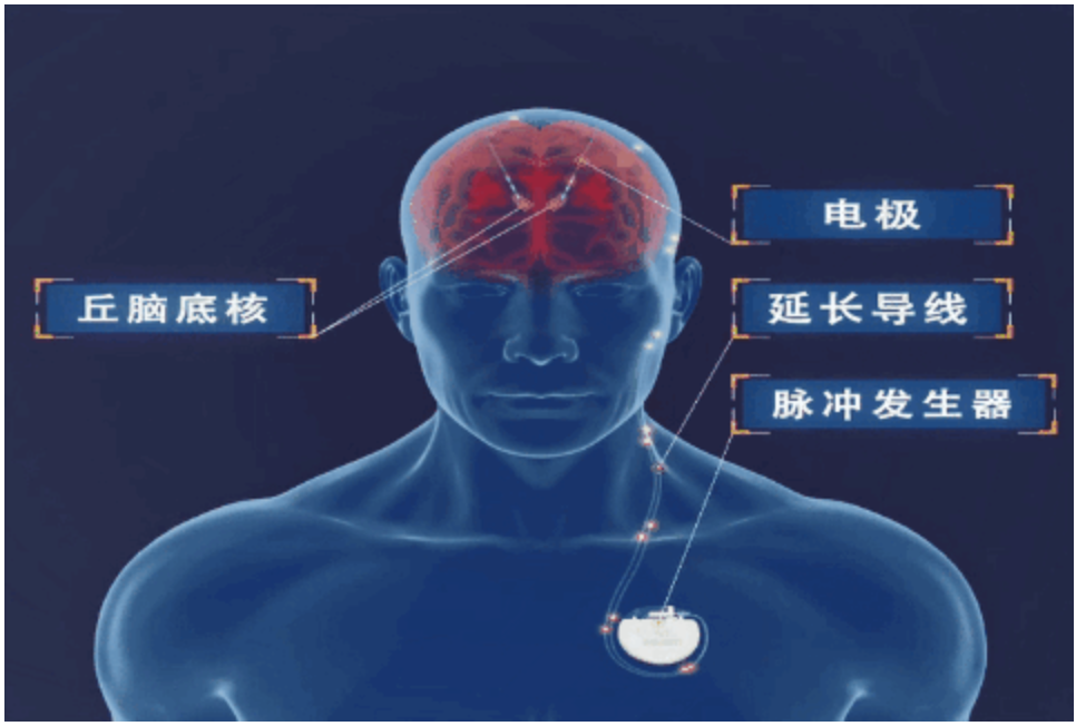 腦起搏器是腦深部電刺激療法(DBS)的俗稱,這種直接作用于神經(jīng)中樞的人工裝置,通過埋植于胸前的脈沖發(fā)生器向植入在大腦特定靶點的電極發(fā)放弱電脈沖,刺激腦內(nèi)控制運動的相關神經(jīng)核團,抑制引起帕金森病癥狀的異常腦神經(jīng)信號。從而消除因帕金森病導致的運動失能,并減輕服用藥物產(chǎn)生的運動癥狀波動和異動,成為藥物“蜜月期”結束后首選的治療方法。