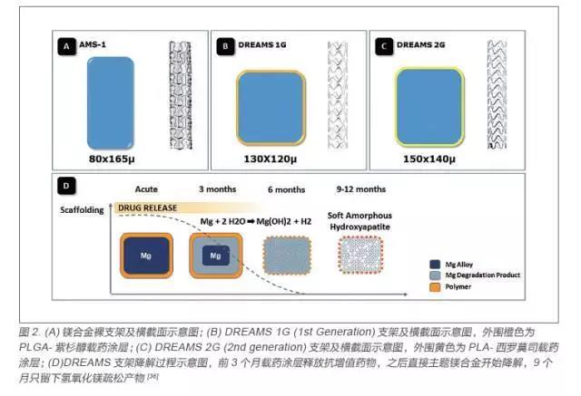 鎂是人體的必需元素,具有多種生理功能,與生命的維持、身體的健康有著極其密切的關(guān)系,因此可降解冠脈鎂合金支架研發(fā)處于可降解金屬支架的領(lǐng)先水平,以德國Biotronik 公司的鎂合金支架為代表, 前后經(jīng)歷了AMS、DREAMS 1G(drug-eluting absorbable metal scaffold 1 generation)和DREAMS 2G(drug-eluting absorbable metalscaffold 2 generation)三代支架(圖2),支架基體采用WE43 鎂合金材料[21]。AMS 為鎂合金裸支架,經(jīng)過PROGRESS 臨床實驗顯示支架具有良好的安全性,且在新生兒體內(nèi)植入兩個AMS支架后,新生兒血清鎂含量處于正常水平,且不需要進(jìn)行二次手術(shù),但是降解速度太快徑向支撐力不足導(dǎo)致晚期管腔丟失現(xiàn)象嚴(yán)重,因此在該基礎(chǔ)上對鎂合金裸支架的成分和構(gòu)型進(jìn)行了更新,加粗了骨架尺寸,添加了一層載有紫杉醇藥物的可降解PLGA 高分子涂層,從而增強(qiáng)了支架支撐力,減少內(nèi)膜增生以及降低降解速率,研發(fā)出了DREAMS 1G[22-24]。