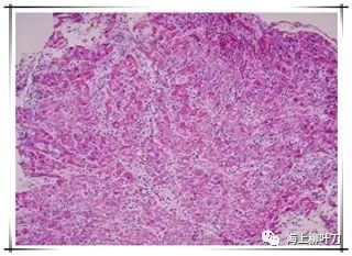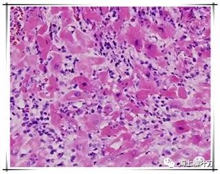 7.100倍還不是看得很清楚,放大400倍就很明顯了,一個(gè)個(gè)藍(lán)點(diǎn)就是淋巴球。這是很厲害的猛暴性心肌炎,整個(gè)心臟都被淋巴球浸潤(rùn)了。
