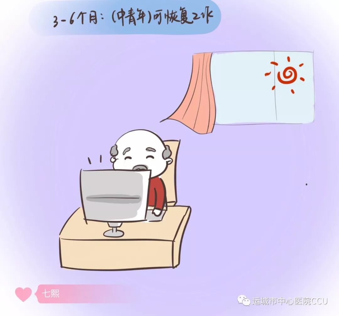 出院后3--6個月:中青年可恢復工作,應注意勞逸結合。
