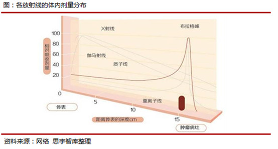 相較傳統(tǒng)的放射方式(γ射線、X射線),質(zhì)子的劑量學(xué)優(yōu)勢更加明顯,其具備明顯而獨特的深度劑量特征。其獨特的布拉格峰可使得質(zhì)子束在射入病灶前不釋放出強大的能量,達到病灶末端時能量幾乎剛好釋放完畢,充分保護了腫瘤病灶前后的正常組織。這種特性使得質(zhì)子重離子相對其它射線天然地更為適合用于放療。